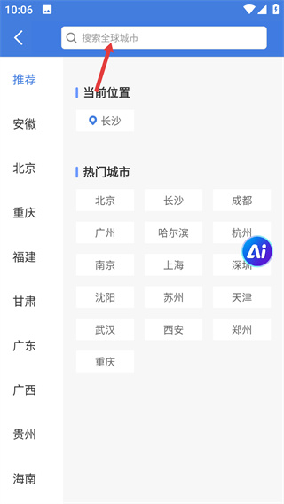 3、进入城市选择页面,可通过顶部搜索框搜索全球城市,也能选择热门城市列表中的城市选项来添加。