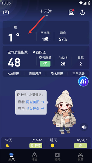 4、选定目标城市(如天津)后,页面会切换显示该城市的气温、风力等气象信息,完成城市天气的切换查看。
