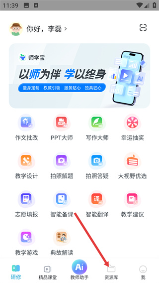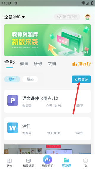 1、进入师学宝的“研修”页面,点击底部导航栏的“资源库”选项,进入资源库界面,可查看各类教师资源内容。