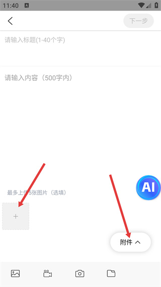 3、进入资源发布编辑页面后,需填写标题、内容,还可上传图片(最多5张)或添加附件,点击图片区域的加号按钮,弹出上传方式的选择弹窗。