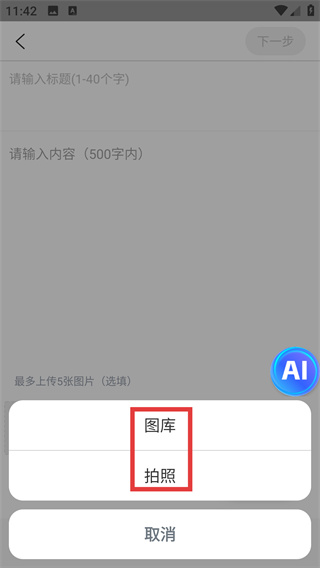 4、在上传方式弹窗中,可选择“图库”(从手机相册选取图片)或“拍照”(现场拍摄图片)的方式,完成资源配图的上传操作。