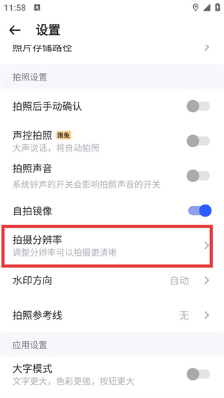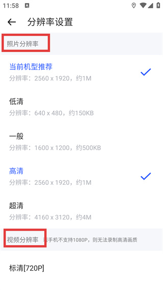 4、在分辨率设置界面,可选择照片分辨率,同时也能配置视频分辨率,完成拍摄清晰度的参数调整。