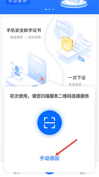 1、进入初次使用界面,看到扫描服务二维码的提示后,点击【手动添加】按钮,进入服务添加的操作页面。