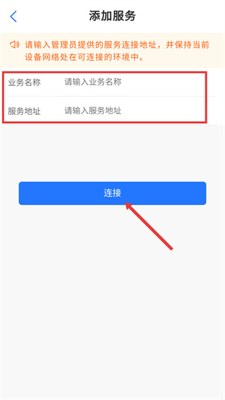 2、在添加服务页面,依次填写【业务名称】与【服务地址】这两项信息,完成后点击【连接】按钮尝试对接服务。