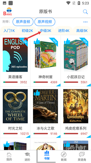 1、进入原版书的书架页面,选择【中级3K】难度分类,可查看该分类下的《神奇树屋》等原版书资源。