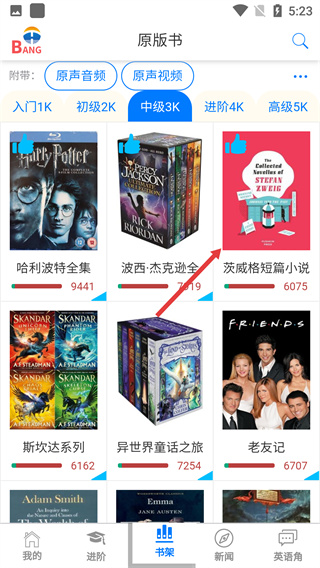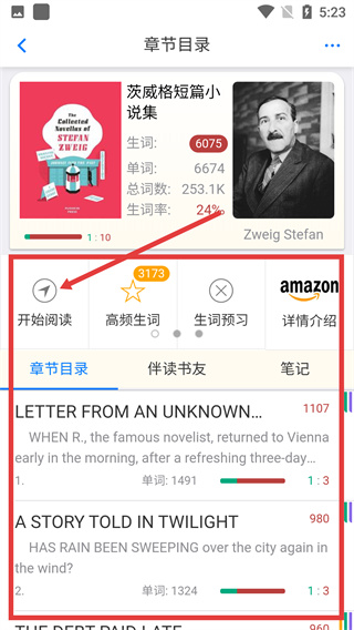 2、在中级3K分类的书籍列表里,选定【茨威格短篇小说集】,进入该书包含生词数等信息的详情界面。