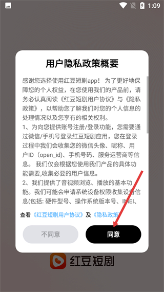 1、阅读《红豆短剧用户协议》与《隐私政策》,确认信息处理规则后,点击【同意】按钮,进入红豆短剧主界面。