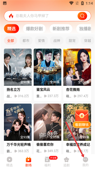 2、在红豆短剧主界面浏览各类剧集,点击底部导航栏的【我的】选项,进入个人功能管理页面。
