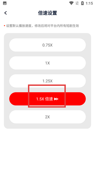 4、在【倍速设置】界面,选择【1.5X倍速】选项,该设置将对平台所有短剧的播放速度生效。