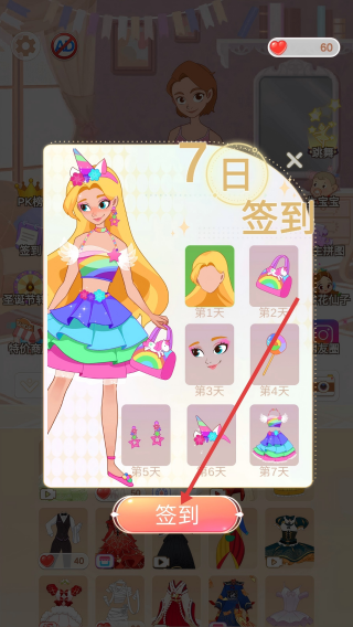 1、进入7日签到界面,点击【签到】领奖励,积累服装与装饰道具。