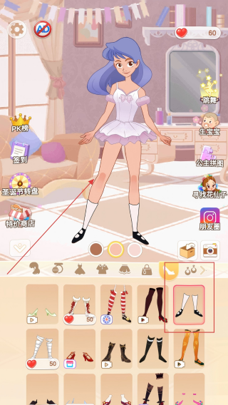 3、切换到袜子栏,挑选适配袜子,搭配已穿裙子,丰富角色外观。