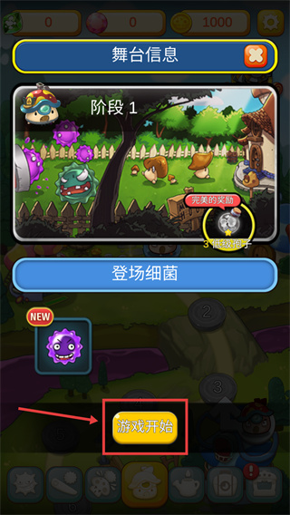 1、进入【阶段1】界面后,先查看【登场细菌】并点击【游戏开始】按钮,即可开启关卡挑战。