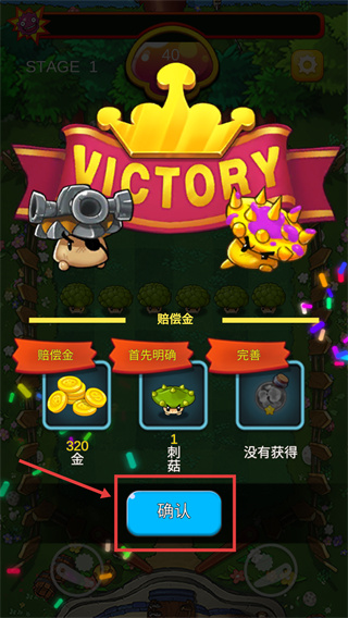 4、通关后出现【VICTORY】界面,可领取【320-金】和【1-刺菇】奖励,点击【确认】即可结算。