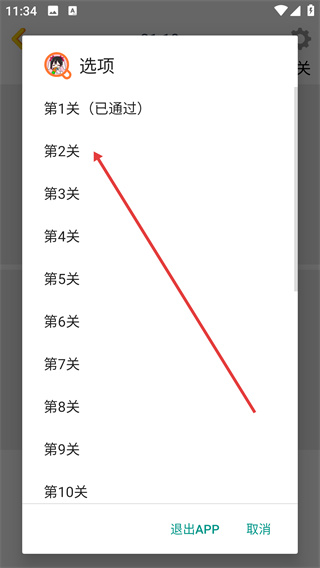 1、进入关卡选择界面,点击箭头指向的【第2关】进入挑战。