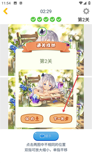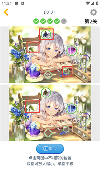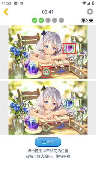 2、【第2关】为找不同关卡,需点击两图中不同位置,可通过【双指缩放-单指平移】辅助查看,先定位标注的差异区域。