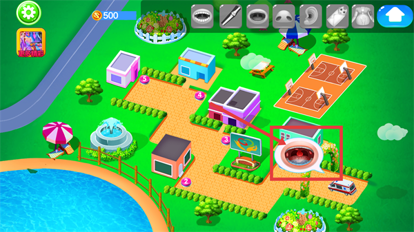 1、处于园区场景,当前金币【500】,点击红色框内的牙科设施,进入口腔治疗关卡,推进游戏的医疗类玩法流程。