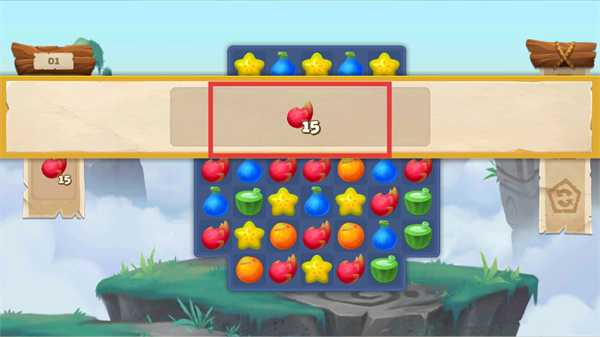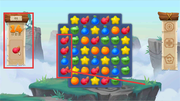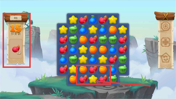 2、需要在移动数内消除火龙果的任务,消除红框内的对应元素,减少步数以推进收集进度。