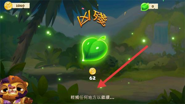 4、当前关卡挑战成功获得一片叶子奖励,点击任意区域继续,推进游戏进度。