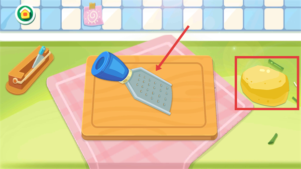 2、进入备菜环节,使用【擦丝器】工具,对右侧的食材进行处理,完成备料步骤。
