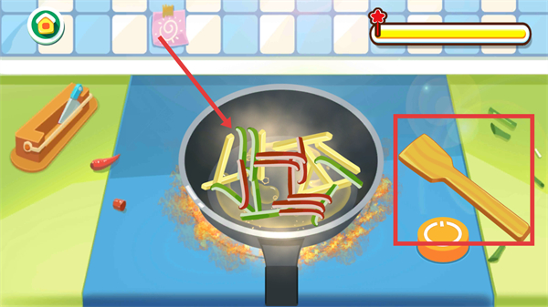 3、将处理好的食材放入锅中,用【锅铲】工具进行翻炒,完成烹饪操作。
