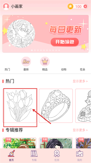 1、在小画家界面,点击红色框选的郁金香图案,进入该图案的涂色关卡,开启本次数字涂色创作的游玩环节。