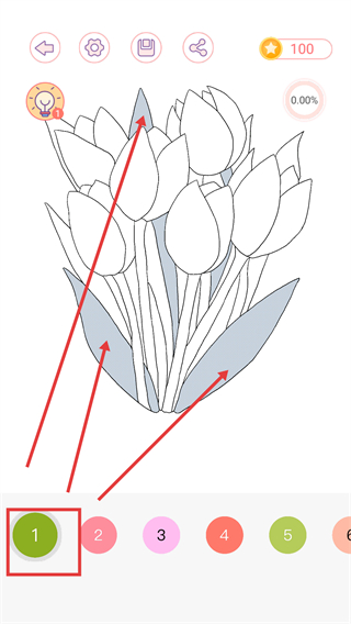 2、进入涂色界面后,选择红色框选的数字1对应颜色,点击对应区域完成该部分涂色,推进本次涂色的创作进度。