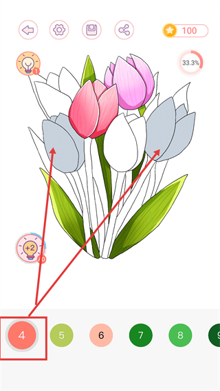 3、切换红色框选的数字4对应颜色,点击对应区域完成涂色,进一步丰富郁金香图案的色彩细节。