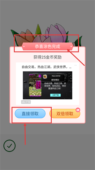 4、涂色完成后出现提示,点击红色框选的直接领取按钮,获取25金币奖励,完成本次小画家的涂色流程。