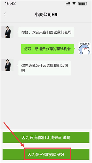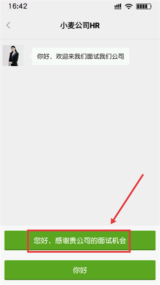 2、面对【小麦公司HR】的欢迎语,选择“您好,感谢贵公司的面试机会”选项,推进对话流程。