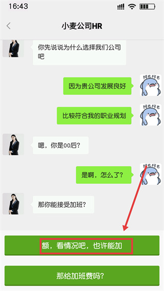 4、应对加班相关问题时,可选择“那给加班费吗?”的选项,既回应问题也符合角色的打工设定。
