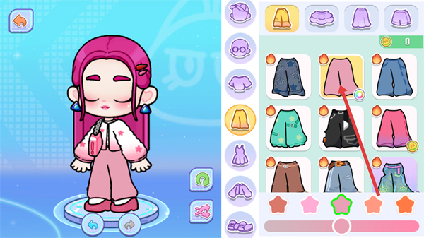 4、切换至裤子装扮分类,点击右侧面板内的对应裤子选项,即可为角色更换新的装扮,丰富装扮的细节内容。