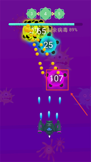 1、战斗时优先攻击标红的高数值目标(如【107】),同时关注【剩余病毒-89%】进度,高效推进关卡。