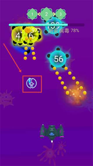 2、出现标红的【飞船图标】时及时触发,可获得增益效果,助力清理【56】这类中数值病毒单位。