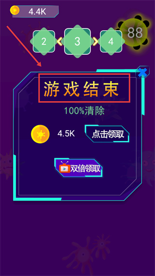 3、达成【100%清除】后,选择【点击领取】获取【4.5K】金币,也可看广告选【双倍领取】拿更多奖励。