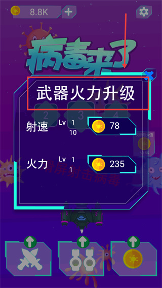 4、利用金币进行【武器火力升级】,优先提升【射速-Lv1】,快速增强输出能力。
