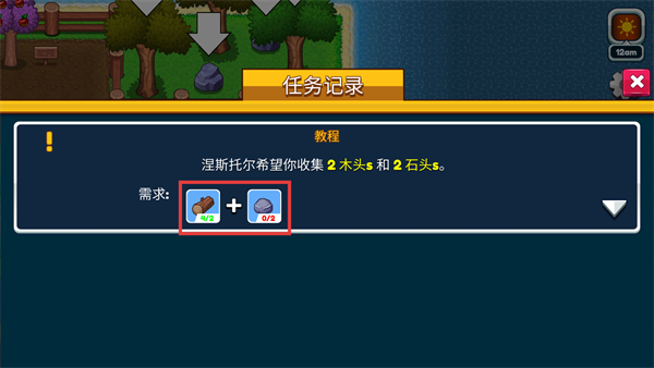 1、查看【任务记录】,按照【涅斯托尔】要求,需要收集木头和石头。