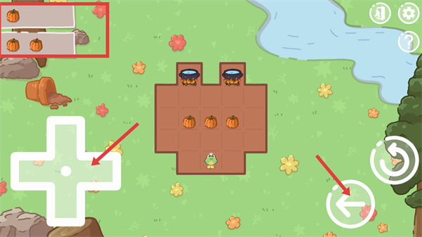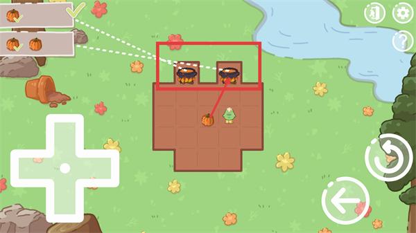 2、在关卡内,通过左下按钮控制绿色角色移动,推动【南瓜】等食材,向目标大锅方向前进,右下返回键可撤回步数。