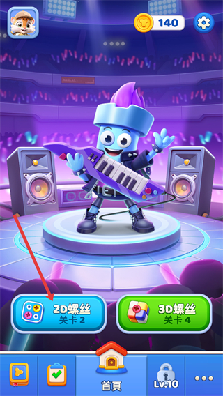 1、在主界面点击【2D螺丝-关卡2】按钮,进入对应关卡开启螺丝消除挑战。