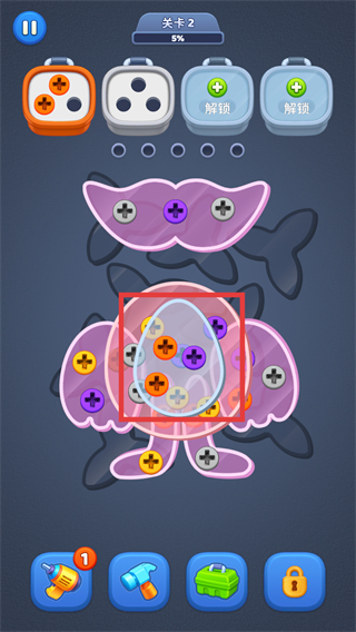 2、观察上方【橙色螺丝-容器】,将对应颜色螺丝移至匹配容器,推进【关卡2】进度至5%。