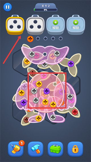 3、完成橙色螺丝匹配后,切换匹配黄色螺丝,使关卡进度提升至9%。