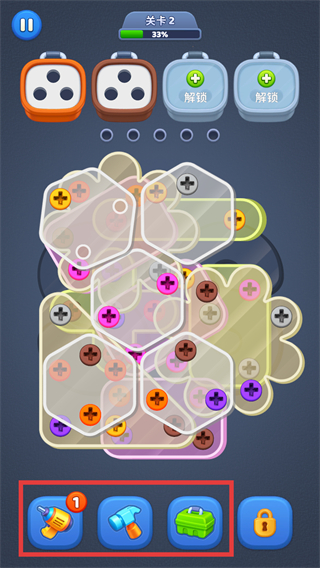 4、利用下方【螺丝刀】等工具,持续匹配对应螺丝,将关卡进度推进至33%。