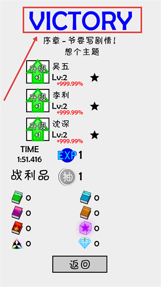 4、获胜后会解锁【VICTORY】结算界面,可领取【EXP】并升级角色,记得查看战利品奖励。