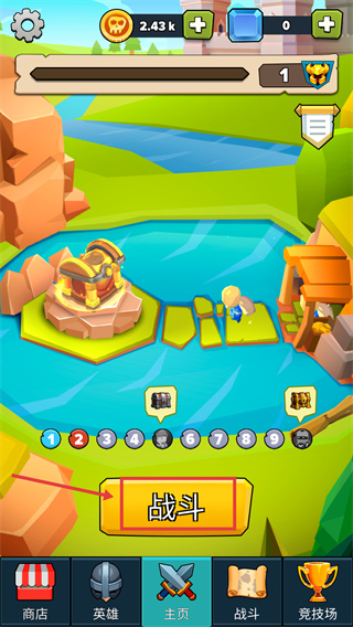 1、在主界面点击【战斗】按钮进入关卡,该界面可查看资源与宝箱,还能通过下方功能栏切换模块。