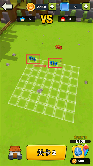 2、关卡中拖动己方【蓝色单位】合并,可提升单位战力,助力应对敌方【红色单位】的进攻。