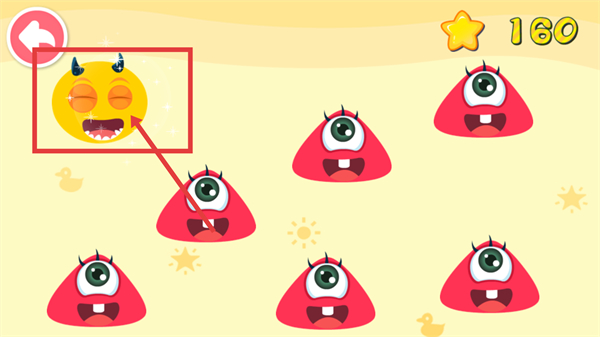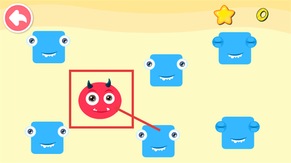 2、识别【红色带角圆形怪物】与【蓝色方块怪物】的形状差异,将红色圆形移到对应区域,完成形状分类。