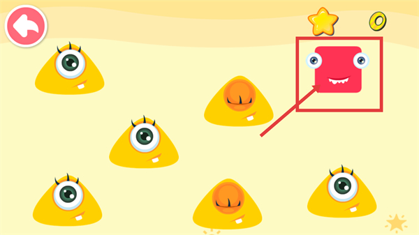 3、区分【红色方块怪物】与【黄色三角形怪物】的形状,把红色方块移到指定位置,完成形状分类挑战。