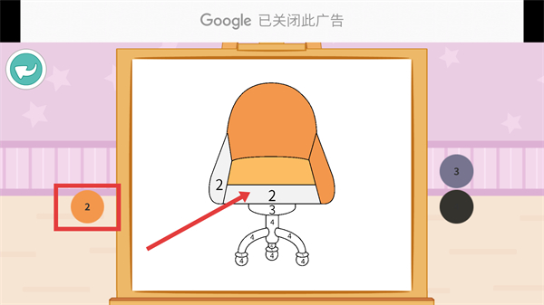 2、在填色关卡中,点击左侧【2】号颜色,为图案里对应【2】的区域填色,推进关卡。