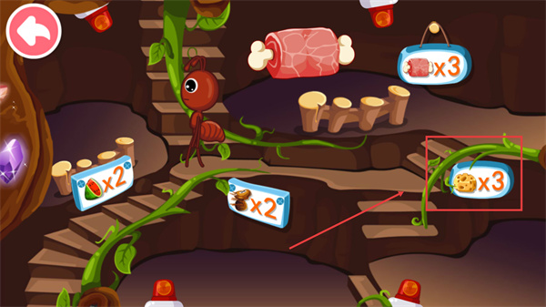 3、在洞穴收集关卡中,根据上方标牌提示,需要收集【x3】肉类、【x2】西瓜、【x2】昆虫和【x3】饼干。