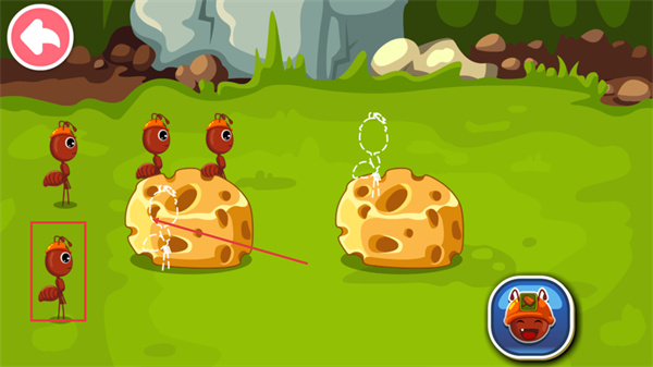 4、任务是引导所有【红色蚂蚁】到达目标点,首先操作左下角被红框标出的蚂蚁,将它们运送至右侧【奶酪】上的虚线轮廓处。