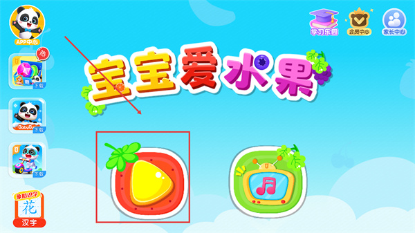1、通过底部红色【草莓播放键】和绿色【电视机图标】进入不同学习模式,右侧【学习乐园】是主要入口。